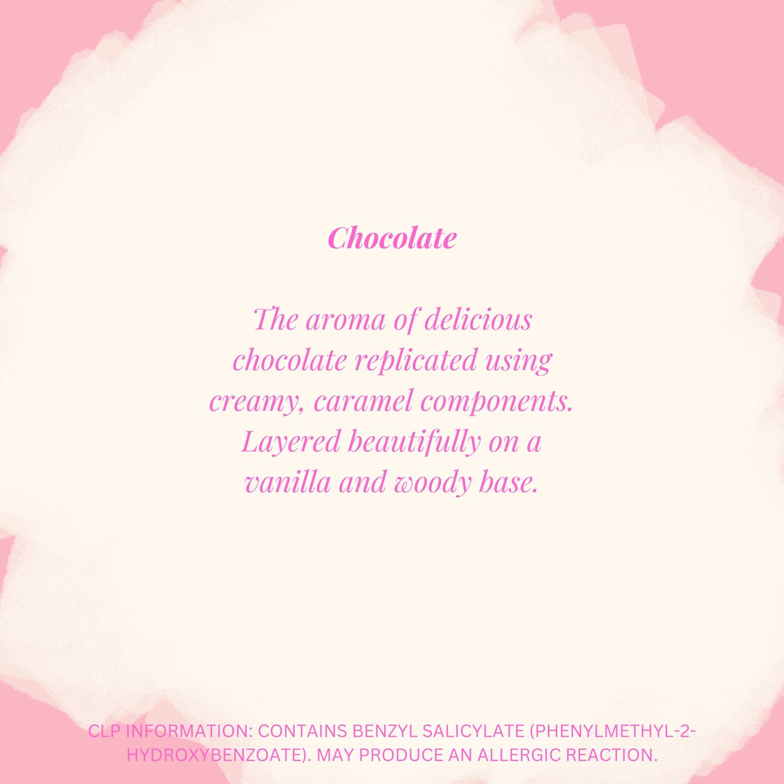 The aroma of delicious chocolate replicated using creamy, caramel components. Layered beautifully on a vanilla and woody base.