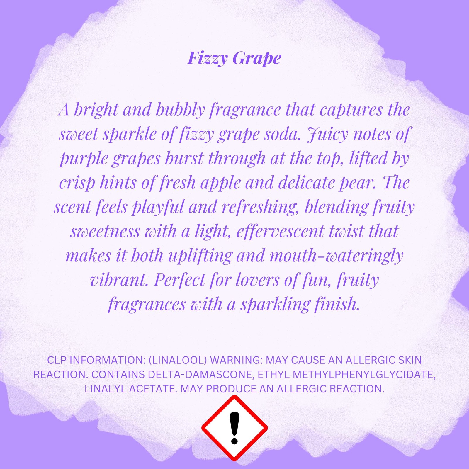 A bright and bubbly fragrance that captures the sweet sparkle of fizzy grape soda. Juicy notes of purple grapes burst through at the top, lifted by crisp hints of fresh apple and delicate pear. The scent feels playful and refreshing, blending fruity sweetness with a light, effervescent twist that makes it both uplifting and mouth-wateringly vibrant. Perfect for lovers of fun, fruity fragrances with a sparkling finish.