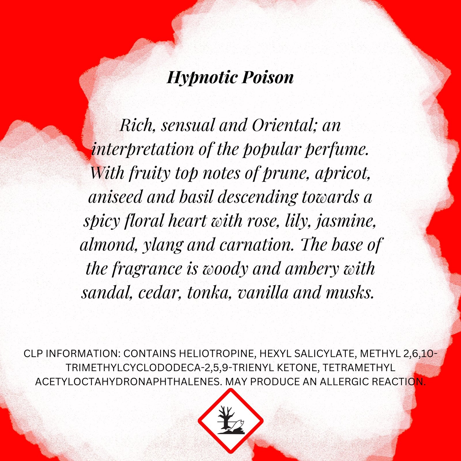 Rich, sensual and Oriental; an interpretation of the popular perfume. With fruity top notes of prune, apricot, aniseed and basil descending towards a spicy floral heart with rose, lily, jasmine, almond, ylang and carnation. The base of the fragrance is woody and ambery with sandal, cedar, tonka, vanilla and musks.